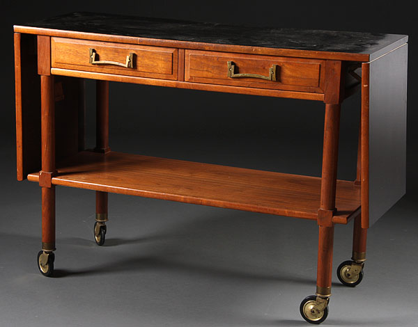 A HERITAGE MID-CENTURY MODERN DRY BAR/SERVER with two drawers, black laminate top and folding wing extensions raised on turned legs with castors. Height 29 inches. Diameter 15 inches. Length 40 inches (73 inches overall).