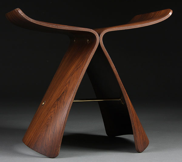 A GOOD SURI YANAGI ROSEWOOD BUTTERFLY STOOL, 20TH CENTURY. With stamped signature. Height 16 inches, width 16.75 inches, depth 12 inches .