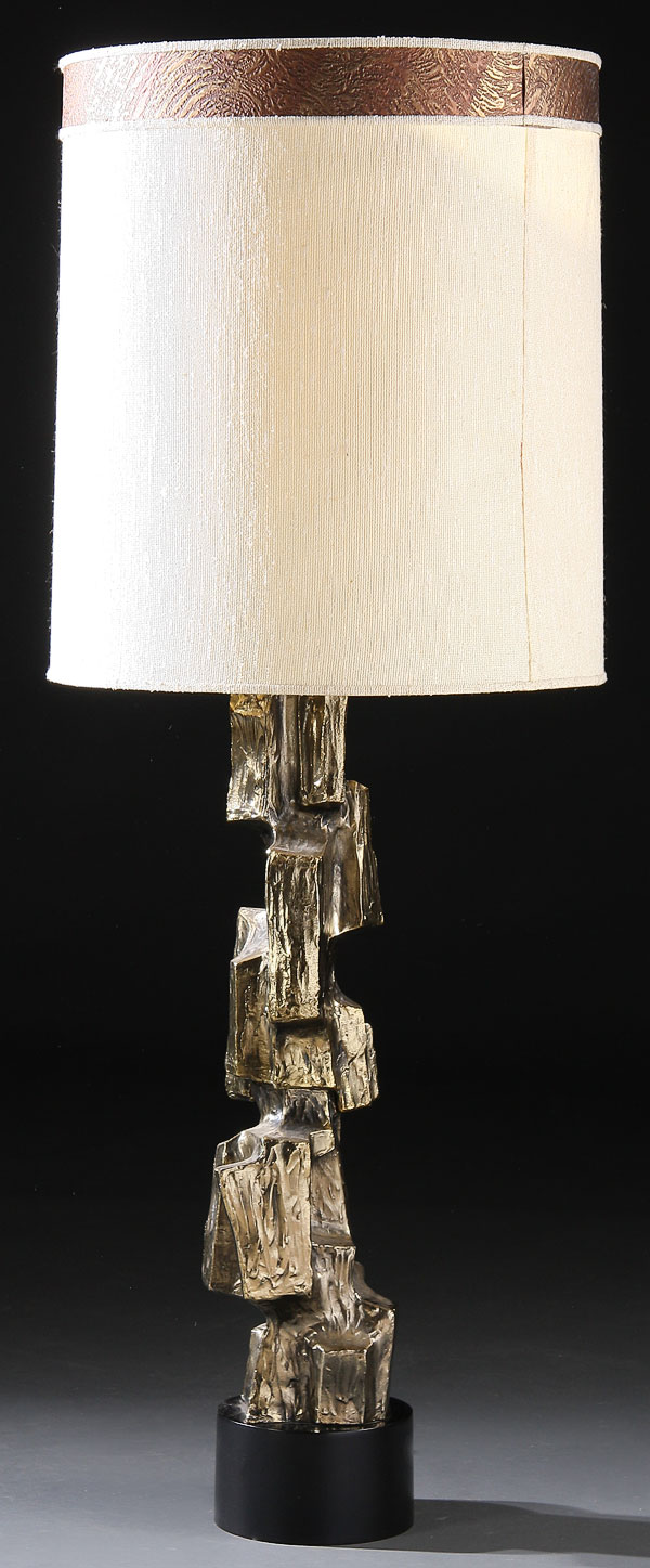 A MID-CENTURY MODERN LAUREL SCULPTURAL BRONZED METAL TABLE LAMP, raised on a black enameled metal plinth with original shade. Height 50.25 inches.