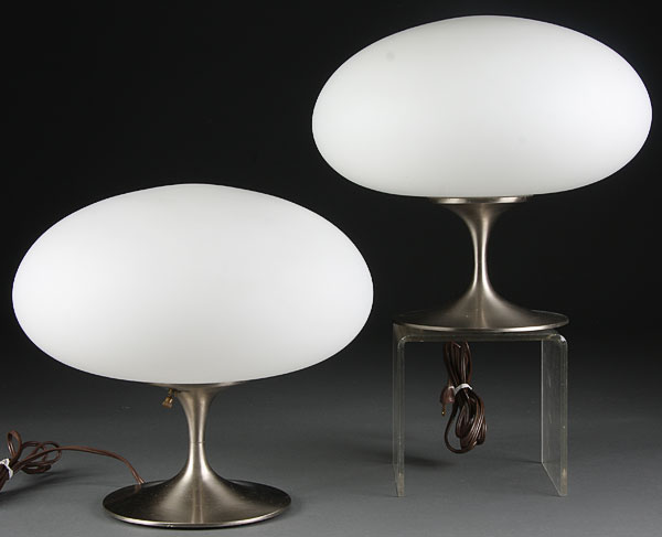 A PAIR OF LAUREL MUSHROOM SHAPED TABLE LAMPS, MID-20TH CENTURY. With acid finish shades on brushed chrome bases. Height 12 inches.