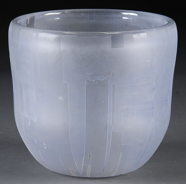 A CONTEMPORARY ACID ETCHED ART DECO STYLE VASE, with powder blue patina. Apparently unsigned. Height 5.25 inches.