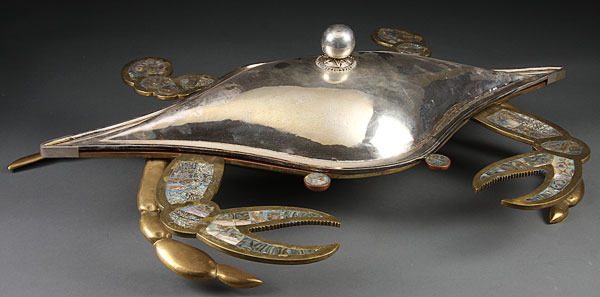 A LARGE AND IMPRESSIVE MEXICAN FCS COBRE SILVERED COPPER BRASS AND ABILONE LIDDED CRAB SHAPE TRAY, MID-20TH CENTURY. Length 31 inches (79 cm).