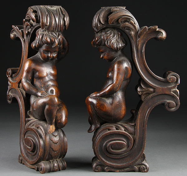 TWO RENAISSANCE REVIVAL CARVED WOOD FIGURAL SUPPORTS, 19TH CENTURY. Probably Italian in the form of putti with scrolled brackets. Height 18 inches.