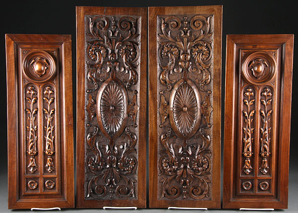 A GROUP OF FOUR CARVED NORTHERN ITALIAN WALNUT DECORATIVE PANELS, CIRCA 1900. Comprising two matching pairs, each with raised foliate decoration. 9.25 inches (21 cm) x 22.5 inches (57 cm) and 9.5 inches (24 cm) x 26 inches (66 cm).