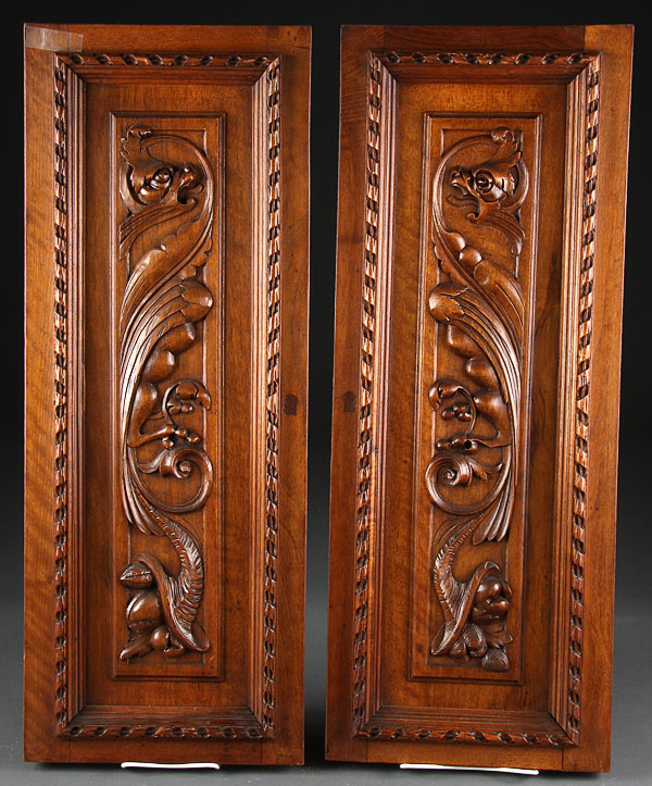 A FINE PAIR OF CARVED NORTHERN ITALIAN DECORATIVE PANELS, CIRCA 1900. With carved scrolled acanthus, Griffin heads and cornucopia. 10.5 inches (26.5 cm) x 27.25 inches (69 cm).