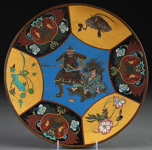 A JAPANESE CLOISONNÉ BRONZE CHARGER, MEIJI PERIOD. Depicting an armored samurai within a rim of alternating floral and taotie mask reserves. Some minor restoration. Diameter 12 inches (30.5 cm).