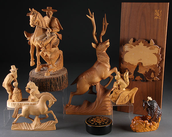 A RUSSIAN CARVED WOOD FIGURAL GROUP, SOVIET PERIOD. Five pieces comprising a large elk, farmer with bear, horse, and squirrel; together with a Russian cut straw lacquer box, a scroll-cut wood marquetry scenic plaque of a wolf and a large Spanish figure of a Caballero. The largest 20 inches.