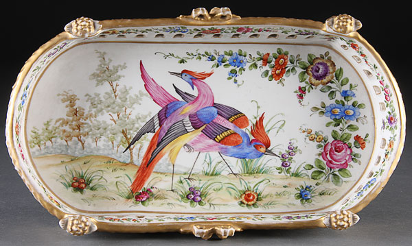 A VERY FINE SCHIERHOLZ DRESDEN HAND PAINTED FERNERY, with hand-painted exotic birds and florals below a reticulated gallery with embossed and gilt swags, raised on four square feet. Length 13 inches (33 cm).