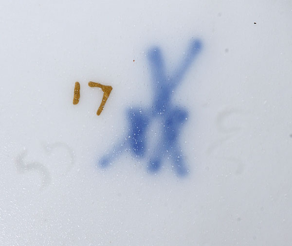 A FOUR-PIECE GROUP OF MEISSEN STYLE HAND-PAINTED PORCELAIN, 19TH CENTURY. Comprising a cup and saucer with florals, butterflies and insects and matching covered sugar bowl with sculpted facial mask handles (lid finial repaired) and creamer. Blue underglazed crossed sword marks. Height 4.5 inches (11.5 cm).