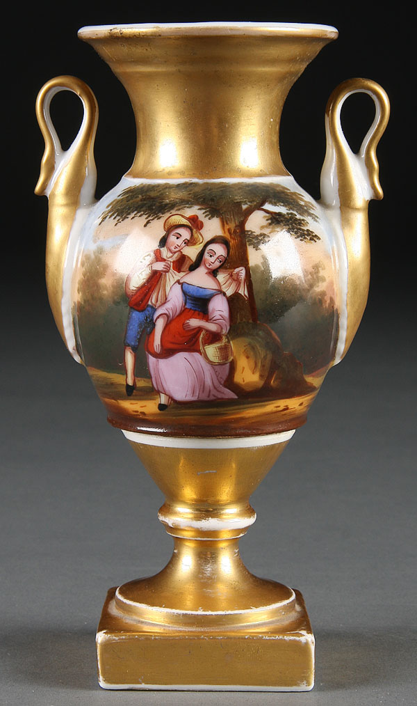 A FRENCH OLD PARIS PORCELAIN CABINET URN, 19TH CENTURY. With enameled courting scene and figural swans' head handles. Height 6.75 inches.