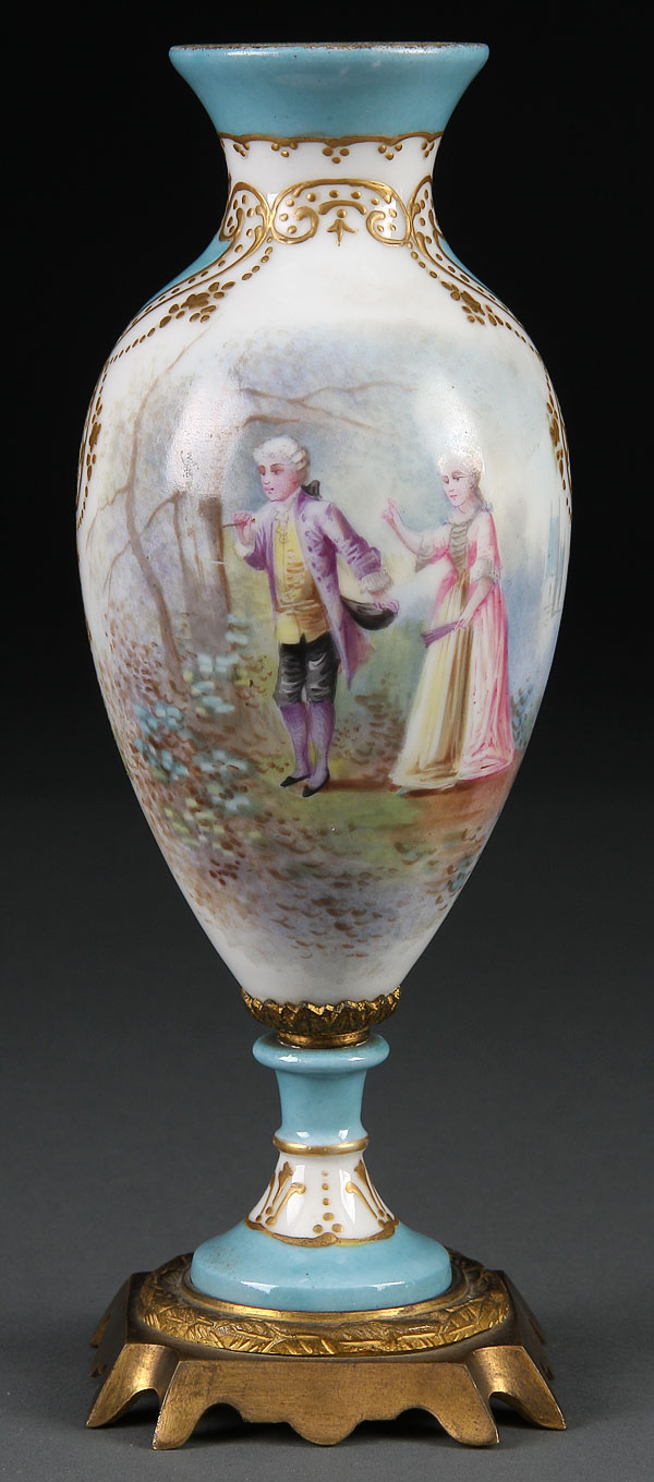 A SEVRES STYLE FRENCH HAND-PAINTED AND GILT BRONZE URN, artist signed "Luigi." Lid absent. Blue double L style mark. Height 8.5 inches (21.5 cm).