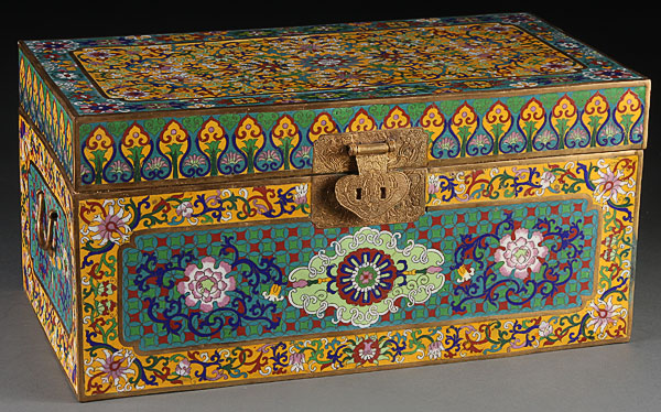 A LARGE CHINESE GILT BRONZE AND CLOISONNÉ ENAMELED WEDDING CHEST, the lidded rectangular chest decorated all over with scrolling chrysanthemum blossoms and vines within borders of auspicious motifs. The lid lifting to reveal a silk-lined interior in Imperial yellow. Length 20 inches (51 cm), height 9.75 inches (25 cm).