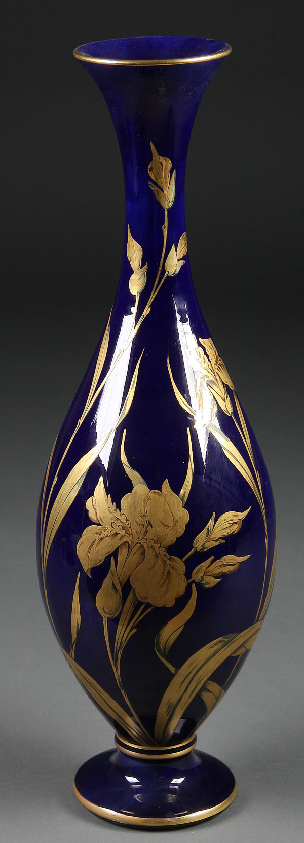 A LARGE CONTINENTAL COBALT BLUE AND GILT DECORATED BALUSTER VASE, CIRCA 1900. With large hand painted gilt iris blossoms and leaves. Apparently unmarked. Height 22.5 inches (57 cm).