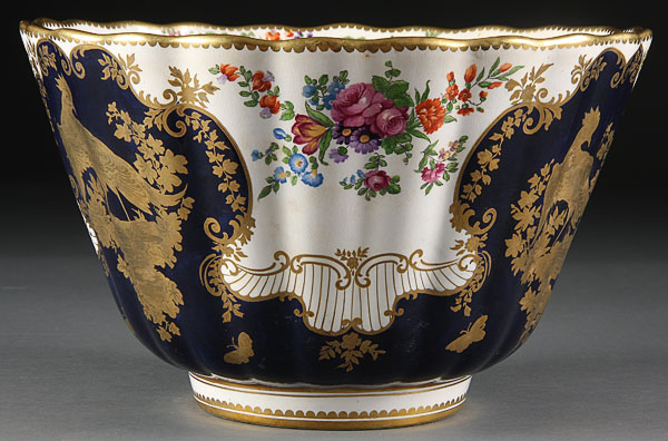 A LARGE BOOTHS ENGLISH PUNCH BOWL, CIRCA 1900, decorated with gilt exotic birds on cobalt blue ground with transfer florals. Diameter 12.25 inches (31 cm).