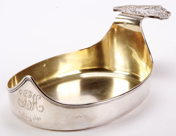 A MASSIVE FABERGÉ SILVER-GILT KOVSH, MOSCOW, 1895. Of traditional form with flat oval base and raised prow, the front engraved with an interlocking monogram JSH and dated 1 March 1895. The flat stylized handle cast and chased with a Sirin amidst scrolling foliage. Hallmarked Moscow, dated 1895, Cyrillic maker's mark KFABERGE under the Imperial Warrant and 88 silver standard. Also with scratched inventory number 4970. Length 13.75 inches (34.5 cm). Total weight 27.48 troy ounces.