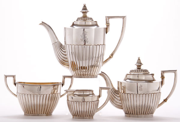 AN IMPRESSIVE FABERGÉ SILVER FOUR-PIECE TEA AND COFFEE SERVICE, MOSCOW, CIRCA 1910. Comprising a coffee pot, a teapot, a two-handled sugar bowl and creamer, the lower sections of the bodies gadrooned and set on reeded foot rims, the lids hinged, with harp-shaped handles and gilded interiors, engraved with Cyrillic initials AS. Hallmarked Moscow 1908-1917, and in Cyrillic KFABERGE beneath the Imperial Warrant, and with 84 silver standard, and defaced inventory number 22929. Height of largest 8.5 inches (21.5 cm). Total weight 57.96 troy ounces.