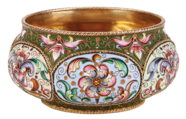 A RUSSIAN SILVER-GILT AND SHADED CLOISONNÉ ENAMEL BOWL, FEODOR RUCKERT, MOSCOW, 1896-1908. The circular bowl with raised oval lobes decorated in shaded multi-color floral and foliate motifs with alternating grounds of pale blue, cream and peach against an overall olive green ground. Hallmarked Moscow 1896-1908, Cyrillic maker's mark FR for Feodor Ruckert and with 88 silver standard. Diameter 3.9 inches (10 cm).