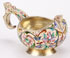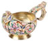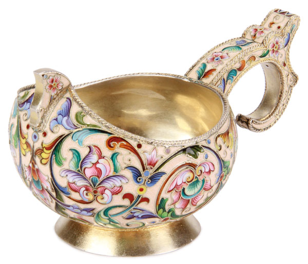 A RUSSIAN SILVER-GILT AND SHADED CLOISONNÉ ENAMELED KOVSH, FEODOR RUCKERT, MOSCOW 1896-1908. Of traditional form, resting on a flared circular base overall enameled in multicolored scrolling floral and foliate motifs with large flower heads against a peach ground. The shaped scroll handle and prow similarly decorated, and with rope twist borders. Hallmarked Moscow 1896-1908, Cyrillic maker's mark FR for Feodor Ruckert and 84 silver standard. Length 4.25 inches (11 cm).