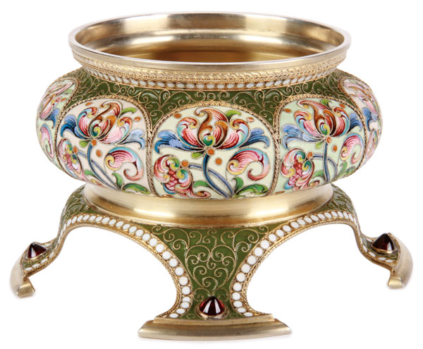 A VERY FINE RUSSIAN SILVER-GILT AND SHADED CLOISONNÉ ENAMEL BOWL, YAKOV BORISOV, MOSCOW, 1896-1908. The bombe-sided bowl, resting on flared shaped feet set with cabochon garnet stones, decorated in a series of arched cartouches containing multi-color flowerheads against a cream ground and the overall olive green background set with scrolling filigree wires and bands of white opaque enamel beads. Hallmarked Moscow 1896-1908 and Cyrillic maker's mark Ya. B. and 84 silver standard. The base engraved with inscription in memory of a visit to St. Petersburg by Henry Hugh Hanna and his wife Anna, dated 1903. Width 5.25 inches (13.3 cm).
