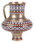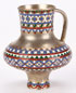 A RUSSIAN SILVER-GILT AND CHAMPLEVÉ ENAMEL MINIATURE KVAS JUG, MOSCOW, 1876. The base, central section and rim banded in champlevé enamel of geometric designs. Hallmarked Moscow, dated 1876 and maker's marks stamped in Cyrillic 'POSTNIKOV' and with 88 silver standard. Height 3.8 inches (10 cm).
