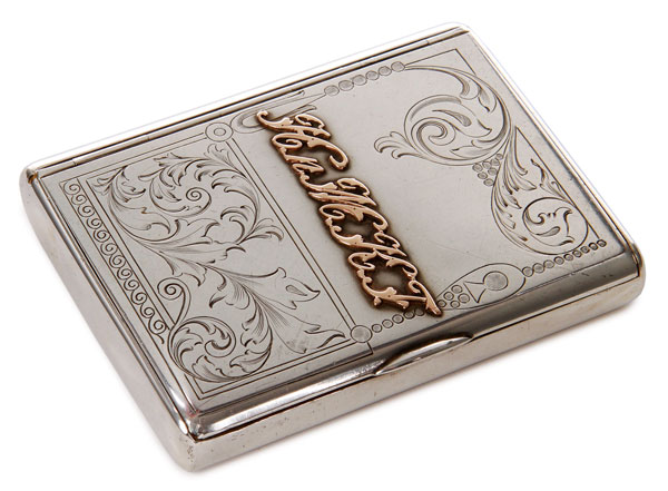 A RUSSIAN SILVER CIGARETTE CASE, KHLEBNIKOV, MOSCOW, CIRCA 1908-1917. Of rectangular form with rounded corners, the hinged lid decoratively engraved and set with four gold letters. The interior gilded and hallmarked Moscow circa 1908-1917, Cyrillic maker's mark of Khlebnikov with Imperial Warrant and 84 silver standard. Length 4 inches (10 cm).