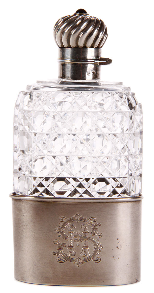 A FABERGÉ SILVER-MOUNTED CUT GLASS FLASK, MOSCOW, 1908-1917. Cut with a faceted diaper pattern, the base engraved with initials SH, the hinged cap cast with swirling gadroons and set with a cabochon sapphire. Hallmarked Moscow 1908-1917 and in Cyrillic KFabergé beneath the Imperial Warrant and with 84 silver standard. Height 4.6 inches (12 cm).