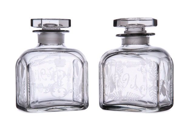 A PAIR OF IMPERIAL RUSSIAN GLASS DECANTERS, 1791. The slightly flattened square body with rounded shoulders and chamfered corners. The front engraved with the monogram of Empress Catherine II (Catherine the Great), and the verso of both dated 1791. The side panels etched with flowers and the inset octagonal stopper also etched with the cipher of Empress Catherine II. The bottom with ground pontil. Probably the Imperial glassworks. Height 6.25 inches (15.7 cm).