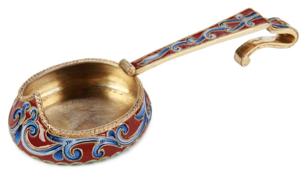 A RUSSIAN SILVER-GILT AND SHADED ENAMELED KOVSH, MARIA SEMENOVA, MOSCOW, 1896-1908. Highly stylized form with shaded enamel of scrolling foliage and the long hook handle similarly decorated. Hallmarked Moscow circa 1896-1908, Cyrillic maker's mark MS for Maria Semenova, and 84 silver standard. Length 4.25 inches (11 cm).