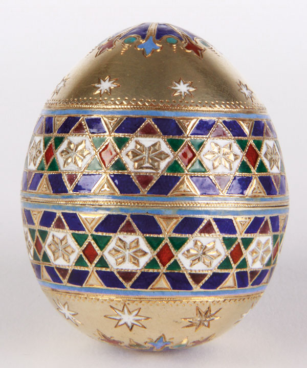 A RUSSIAN SILVER-GILT AND CHAMPLEVÉ ENAMELED EASTER EGG, MOSCOW CIRCA 1890. The two part egg with fitted cover decorated with bands of geometric designs at center, and on the base and top, flower heads and star forms. The interior brightly gilded. Hallmarked Moscow circa 1890, indistinguishable maker's marks and 84 silver standard. Height 2 inches (5.1 cm).