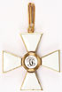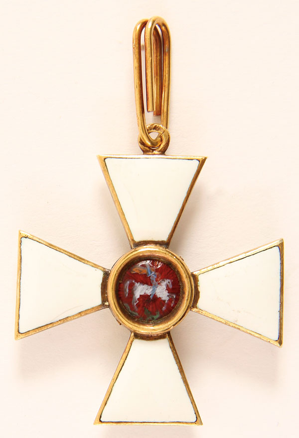 AN IMPERIAL RUSSIAN ORDER OF ST. GEORGE, 4TH CLASS. Gold and white enameled cross form, the central medallion depicting St. George slaying a dragon. Suspension loop indistinguishably marked. 37 mm x 37 mm. Some enamel loss.