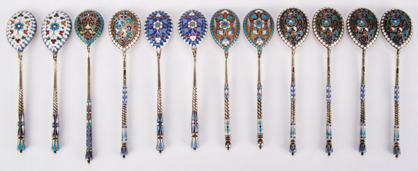 A GROUP OF RUSSIAN SILVER-GILT AND CLOISONNÉ ENAMELED TEASPOONS, MOSCOW CIRCA 1890. Comprising a matching set of six, three matching pairs and one unmatching. Each hallmarked Moscow with 84 silver standard and various maker's marks. Greatest length 4.6 inches (11.8 cm).