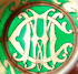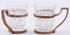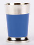 A RUSSIAN SILVER AND ENAMELED VODKA GLASS, MOSCOW CIRCA 1890. Of tapered cylindrical form, with blue enameled sides, flared ring foot and plique a jour enameled base with silhouette monogram visible when held to light. Hallmarked Moscow circa 1890, Cyrillic maker's mark AP and Cyrillic retailer's mark of Grachev and 84 silver standard. Height 2 inches (5.3 cm). Together with a pair of Russian silver vodka glass holders. The silver frames with large hook handles decorated with foliate leaf and berry pattern, the upper rim in Greek key and the foot ribbed. With cut glass inserts. Bearing hallmarks for Moscow 1896-1906 and Cyrillic Faberge marks and 84 standard. Height of frames 1.75 inches (4.5 cm). (Unillustrated)