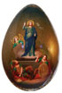 A LARGE RUSSIAN PAPIER-MÂCHÉ AND LACQUER EASTER EGG, LUKHUTIN, 1866. The front beautifully painted in the naturalistic manner depicting the western style scene of the Resurrection of Christ on a luminescent gold field. The verso similarly painted with full length images of the Guardian Angel and Saint Mary Magdalene. The edge banded in gilt leaves with green tinting along the seam. The interior brightly gilded, with the Lukhutin factory mark and inscribed From the Society of St. Petersburg Priestless Old Ritualists and dated 1866. Height 6.25 inches (16 cm).