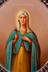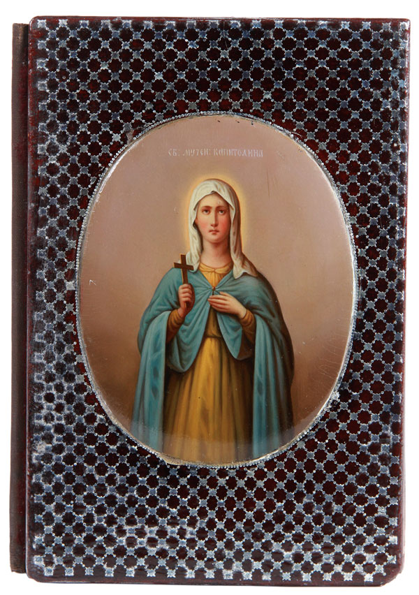 A UNIQUE RUSSIAN PAPIER-MÂCHÉ AND SILVER INLAID ICON FOLIO, 19TH CENTURY. The rectangular formed cover overall decorated with intricate inlaid silver lattice framing a finely painted oval icon of the Holy Martyr Kapitolina (d. circa 304 A.D.). The cloth hinged cover opening to reveal a silk lined interior with fold-out pockets, the verso covered in velvet and in each corner set with a domed brass foot. Most likely Lukutin. 9 inches x 6.25 inches (23 x 15.8 cm).