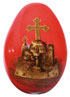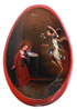 A FINE RUSSIAN LACQUER PAPIER-MÂCHÉ EASTER EGG, LUKUTIN, CIRCA 1880. The cover painted with a scene of the Annunciation within a gilt banded oval cartouche on a red ground. The verso with gilt painted depiction of the articles for the Divine Liturgy, chalice, diskos, gospel, cross, etc. The interior gilded and with the mark of Lukutin beneath the Imperial Warrant. Height 3.75 inches (9.5 cm).