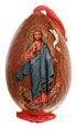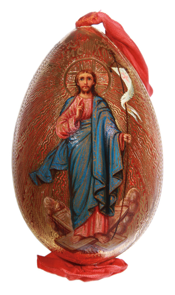A UNIQUE RUSSIAN CARVED AND GILT WOOD EASTER EGG, CIRCA 1890. The front painted with a depiction of the Resurrected Christ standing atop the broken gates of Hell. The body gilded and finely incised with sunburst rays around Christ. Ornamental banding on edge, and verso with circular cartouche incised with the Cyrillic letters XB. With original silk ribbon. Height 3.75 inches (9.5 cm).