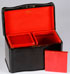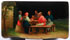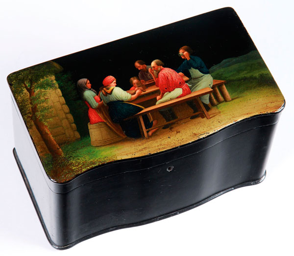 A FINE AND LARGE RUSSIAN LACQUER TEA CADDY, LUKUTIN, 19TH CENTURY. The rectangular form with serpentine front with conforming lid. The hinged lid painted with an outdoor scene of peasants eating at a table near dacha. The interior in red lacquer and a pair of removable wooden lid inserts. With Lukutin factory mark beneath Imperial Warrants. Length 10 inches (25.2 cm), width 5.5 inches (14 cm), height 5.6 inches (14.3 cm).