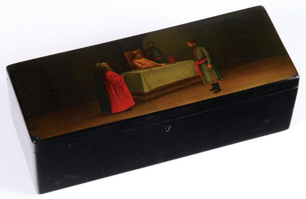 A LARGE AND VERY FINE RUSSIAN LACQUER DRESSER BOX, VISHNIAKOV, 19TH CENTURY. Of rectangular form, the hinged lid with painted court scene. The interior decorated in faux tortoise shell and with “Vishniakov” mark. Length 11.25 inches (28.6 cm), width 4.1 inches (10.5 cm), height 3.8 inches (10 cm).
