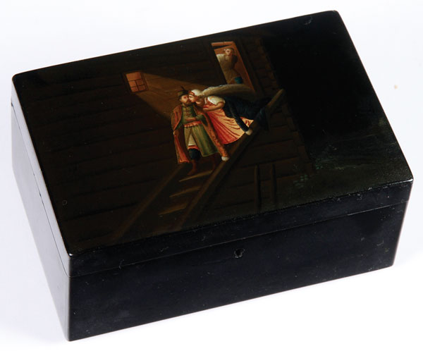 A LARGE RUSSIAN LACQUER BOX, VISHNIAKOV, 19TH CENTURY. Of rectangular form, the hinged lid painted with an elopement scene. The interior in red lacquer and with ”Vishniakov” mark. Length 7.2 inches (18.3 cm), width 4.6 inches (11.8 cm), height 3.5 inches (8.9 cm).
