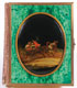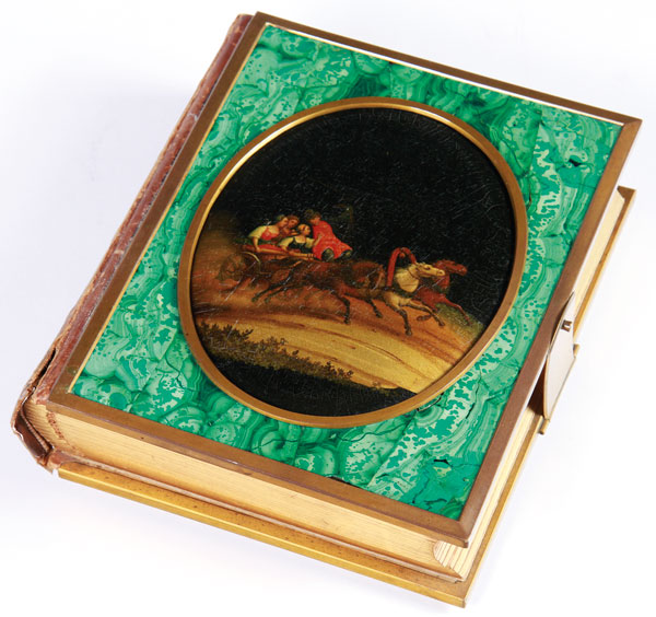 A RUSSIAN LACQUER AND MALACHITE PHOTO ALBUM, VISHNIAKOV, 19TH CENTURY. The malachite cover inset with a painted oval Summer Troika scene. Leather spine and bronze clasps. Containing sixteen pages for photographs. Stamped in the front upper left cover page “Grand Magasin De Paris, Ci-Devant Junker, St, Petersburg”. Length 9 inches (23 cm), width 7.75 inches (19.7 cm), height 2.3 inches (6 cm).