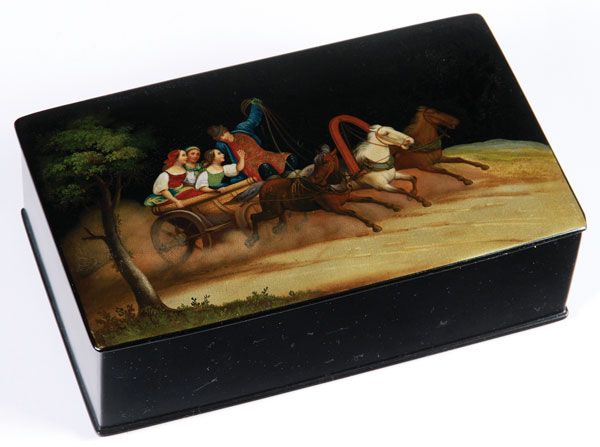 A LARGE RUSSIAN LACQUER BOX, LUKUTIN, 19TH CENTURY. Of rectangular form, the hinged lid painted with a Summer Troika scene and red lacquer interior. With Lukutin marks beneath Imperial Warrants and raised on four circle style feet. Length 9.5 inches (24 cm), width 5.75 inches (14.5 cm), height 3 inches (7.7 cm).