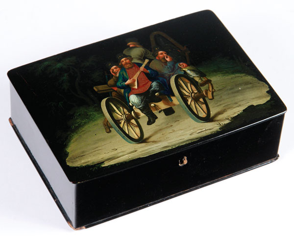 A VERY FINE RUSSIAN LACQUER BOX, LUKUTIN, 19TH CENTURY. The hinged lid painted with a Troika and balalaika player. With Lukutin marks beneath Imperial Warrant and raised on four circle form feet. Length 6.75 inches (17 cm), width 4.75 inches (12.1 cm), height 2.25 inches (5.7 cm).