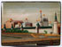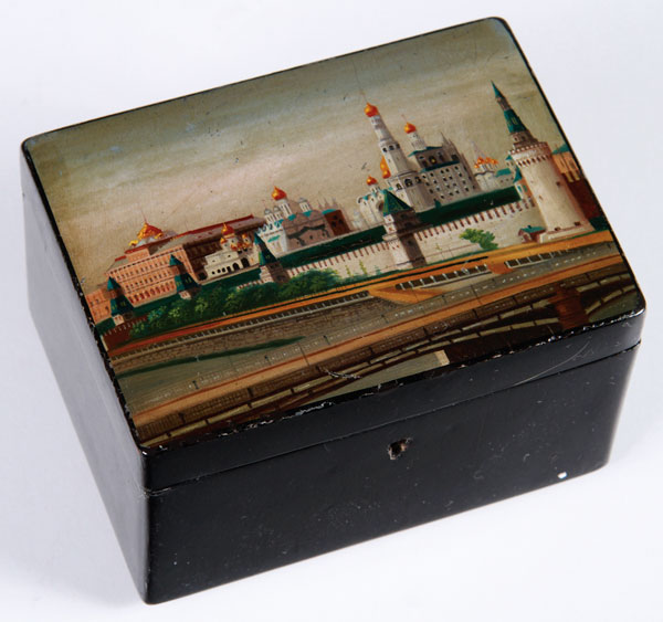 A FINE RUSSIAN TOPOGRAPHICAL LACQUER BOX, VISHNIAKOV, 19TH CENTURY. The hinged lid with a scene of the Moscow Kremlin, red lacquered interior, “Vishniakov” marks and raised on four ball form feet. Length 4.5 inches (11.5 cm), width 3.4 inches (8.6 cm), height 2.75 inches (7 cm).