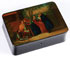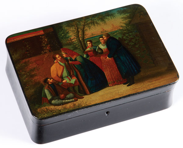 A LARGE RUSSIAN LACQUER BOX, VISHNIAKOV, 19TH CENTURY. Of rectangular form and chamfered edges, the hinged lid painted with a scene of a group of woman serving men wine and bread, red lacquered interior. Marked “Vishniakov” and raised on four feet. Length 7.75 inches (19.7 cm), width 5.3 inches (13.5 cm), height 2.5 inches (6.4 cm).