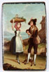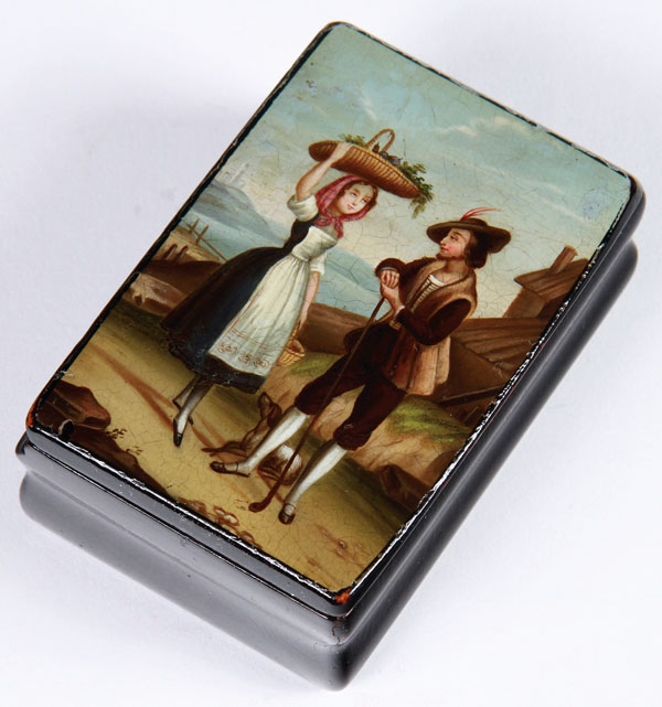 AN EARLY RUSSIAN LACQUER SNUFF BOX, LUKUTIN, CIRCA 1840. The hinged lid with painted scene of a woman returning from market and meeting a suitor along the way. The interior marked in Cyrillic “Lukutin” beneath the Imperial Warrant, 3.25 inches x 2.1 inches (8.3 x 5.5 cm).