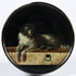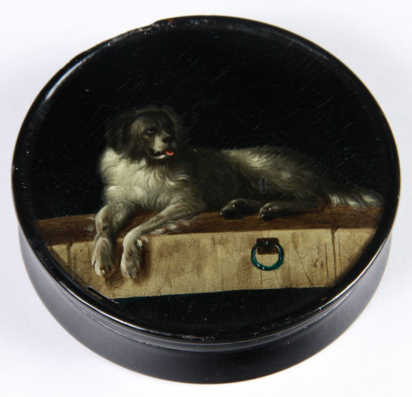 A RUSSIAN LACQUER SNUFF BOX, LUKUTIN, CIRCA 1870. The circular box with fitted lid finely painted with a resting dog. Diameter 2.75 inches (6.1 cm).