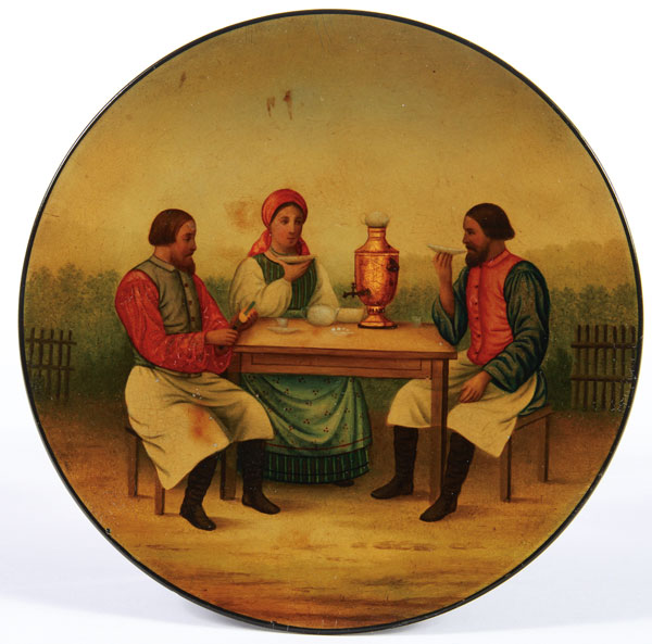 A FINE RUSSIAN LACQUER PLATE, VISHNIAKOV, 19TH CENTURY. Painted with a scene of peasants drinking tea from a samovar. Verso with Vishniakov mark. Diameter 6 inches (15.2 cm).