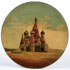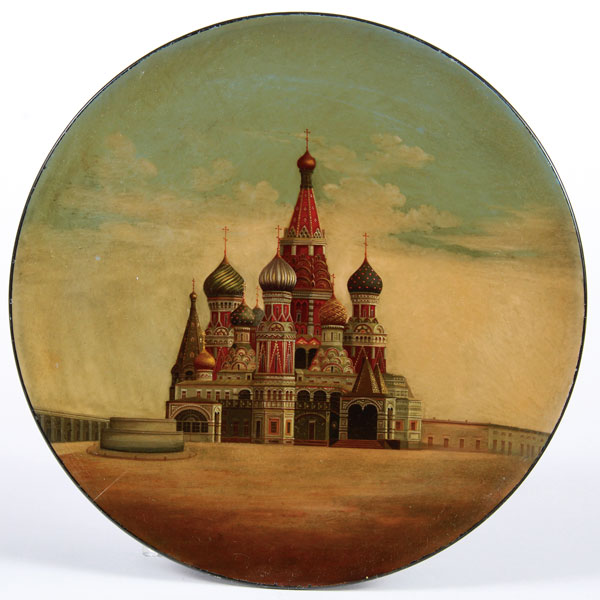 A LARGE RUSSIAN LACQUER PLATE, VISHNIAKOV, 19TH CENTURY. Exquisitely painted with a scene of St. Basil’s Cathedral, Moscow. Verso with Vishniakov mark. Diameter 9.1 inches (23.3 cm).
