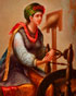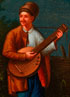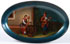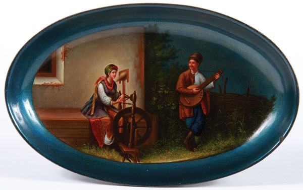 A VERY FINE RUSSIAN LACQUER TRAY, LUKUTIN, 19TH CENTURY. Of oval form, deeply recessed and finely painted with a courting scene depicting a woman spinning wool and a man playing a kobza. Executed on a lustre blue ground, verso with Lukutin mark beneath Imperial Warrants. Length 8 inches (20 cm).