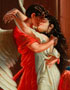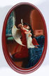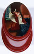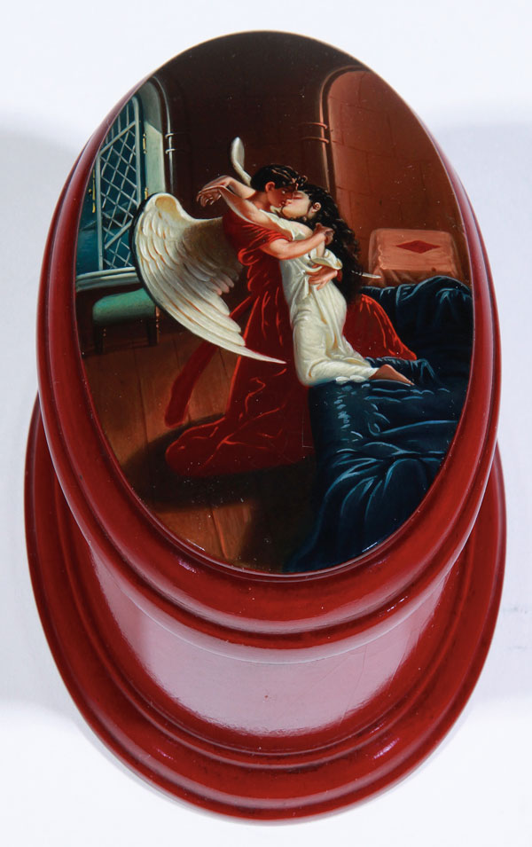 AN EXQUISITE RUSSIAN LACQUER BOX, LUKUTIN, 19TH CENTURY. Of oval form with stepped footed base and fitted lid, beautifully painted with an angel and young woman embracing in a bedroom. The interior with Lukutin mark beneath Imperial Warrants. 4.5 inches x 3 inches x 2.5 inches (11.4 x 7.6 x 6.3 cm).